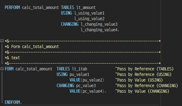 - ์๋ธ๋ฃจํด์ CHANGING ํ๋ผ๋ฏธํฐ ๋ค์ "VALUE ( ํ๋ผ๋ฏธํฐ ๋ช )" ๊ตฌ๋ฌธ์ ์ฌ์ฉํ์ง ์์ ๊ฒฝ์ฐ
